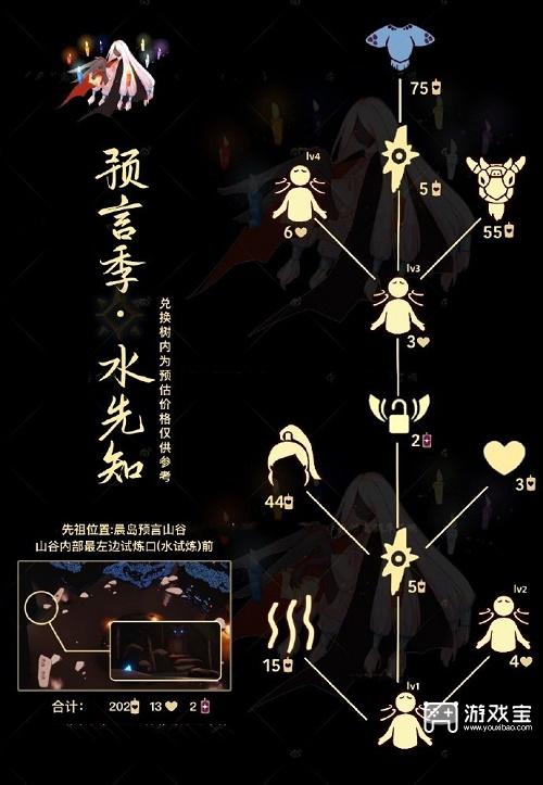 2、玩家可以参考上面的兑换树来攒蜡烛,全部兑换完的话大概需要202蜡烛,13爱心和2个升华蜡烛,价格为测试服,一切以正式服为主。