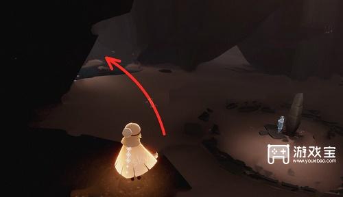 2、穿过狭长通道到达预言山谷后,飞向大厅最左边的小山洞就可以看到先祖了。