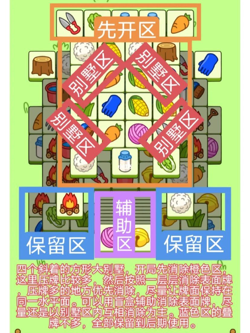 2、开局先消除橙色区的牌,尽量要让牌面保持在同一水平面,然后一层一层消除表面牌,不要跨层太多拿牌,等表面牌消除完后,以大别墅内互相消除为主。