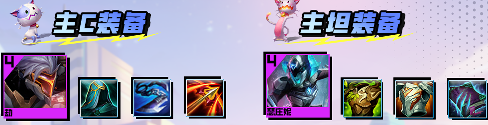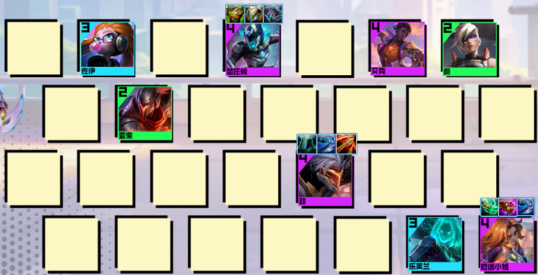 后期阵容 :8人口大搜找到2星劫、厄运小姐以及前排的瑟庄妮。补充佐伊和乐芙兰开出3黑客羁绊。佐伊有淘气包羁绊,可以放在前排吸引火力。