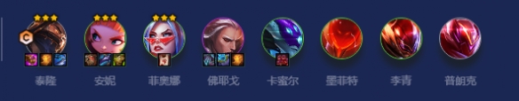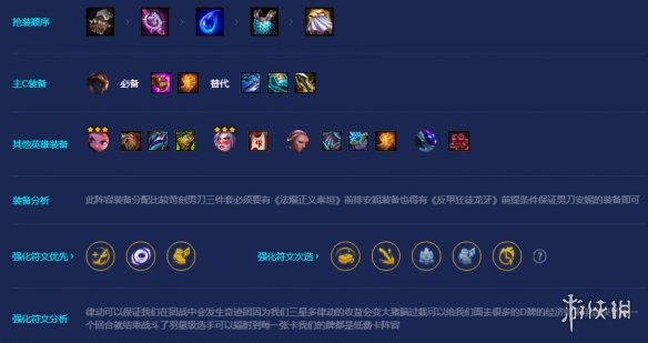 此阵容装备分配比较苛刻男刀三件套必须要有《法爆正义泰坦》前排安妮装备也得有《反甲狂徒龙牙》前提条件保证男刀安妮的装备即可