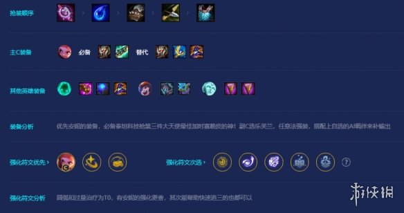 优先安妮的装备,必备泰坦科技枪第三件大天使最佳加时赛赖皮的神!副C选乐芙兰,任意法强装,搭配上自选的AI羁绊来补输出