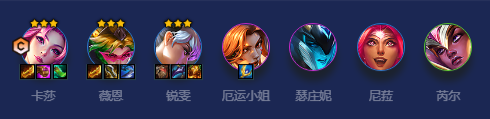 全2星中期很强势,但若不能追出3星,后期输出就很乏力,靠其他卡整体质量也许就吃个分;若能3星注意站位,防对面女枪或者高AOE法系输出秒掉卡莎和VN,则任何阵容都可一战。
