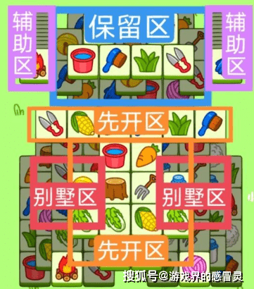 开局先消除橙色区的牌,这里压牌。尽量要让牌面保持在同一水平面,然后一层一层消除表面牌,不要跨层太多拿牌,等表面牌消除完后,以大别墅内互相消除为主。
