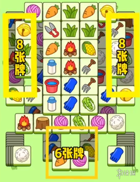 4、图中黄色区域为辅助区,两边分别由8张牌组成,下方中间位置则为6张牌,这些牌都是肉眼可见的牌,前期我们尽量少动这些牌,留到中后期再用。