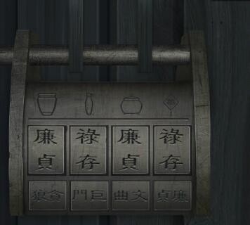 9、拼好图片之后放置到桌子上的架子上找到不同物品的对应字,解开石锁。