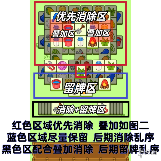 1.牌层自上而下消除,每次消除尽量拿表层牌,逐层消除,不要跳着挖,容易前期就卡住