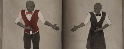 10、给门口的假人戴上假头,按照书中图案摆放好两个假人。