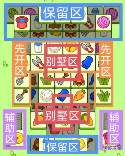 3.必要时可以用紫色盲盒区辅助消除,盲盒区后期不用留太多,留几张备用即可。
