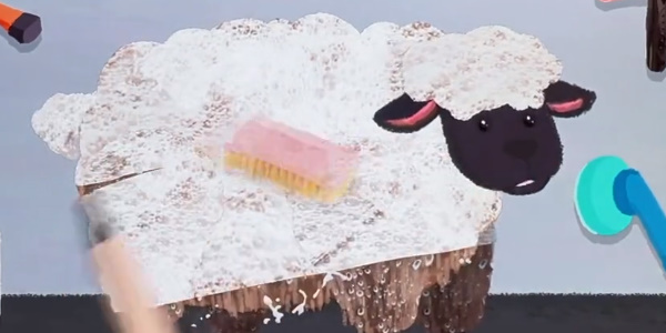 2、接着我们在羊身上挤沐浴露,用粉色刷子刷刷起泡。