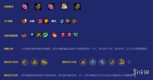 主c德莱厄斯的装备非常重要,因为中期的输出点基本只有德莱厄斯一个人,所以离子火花、珠光护手、正义之手是很重要的。