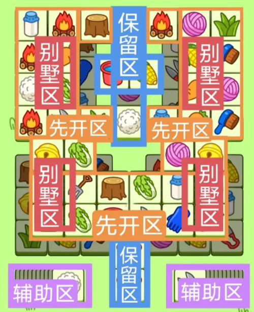 2.开局先消除橙色区的牌,这里压牌。尽量要让牌面保持在同一水平面,然后一层一层消除表面牌,不要跨层太多拿牌,等表面牌消除完后,以大别墅内互相消除为主。