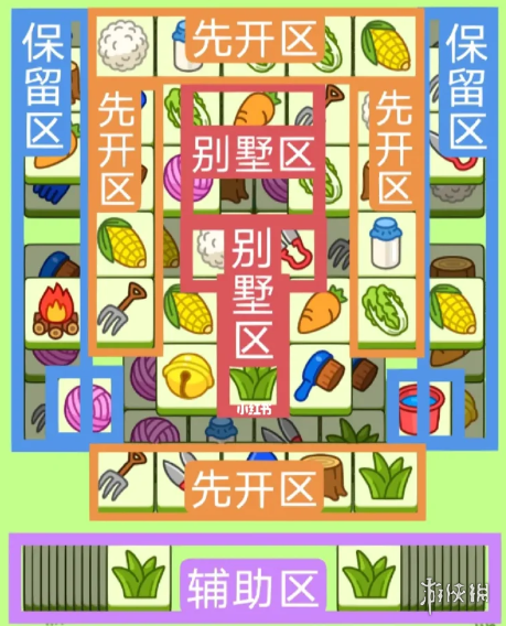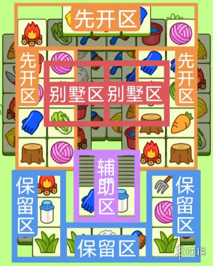 两个方形大别墅。开局先消除橙色区,然后按照一层一层均匀消除表面牌。哪里压牌比较多就在找消除哪里,必要时可以用盲盒区辅助消除表面牌。尽量还是以别墅区内互相消除为主。蓝色区有盖牌,但是不多。全部保留到后期使用。
