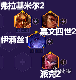 阵容组成:弗拉基米尔、嘉文四世、伊莉丝、派克,最好有一个天选猩红的英雄,谁都可以。