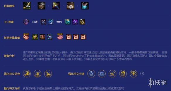 主C希维尔必备最后的轻语和巨人捕手,由于技能自带攻速加成以及基克的先驱辅助作用,一般不需要装备攻速装备;