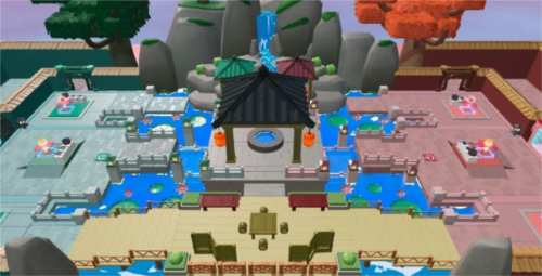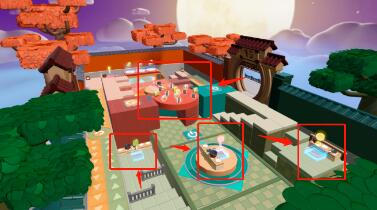 2.各种制作材料分布在中场区域,假山上、茶桌旁还有湖心亭中;
