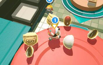 这样我们可以利用料理台位置不同的差异,不需要跑上跑下一个个来回去拿,只需要—个蛋仔在材料台上直接把材料扔下去,另一个蛋仔去放材料到制作台即可。那么,瓜子的话丢入最右边的位置,而红豆以及鸡蛋可以丢到中间的位置。分工合作,效率加倍。