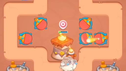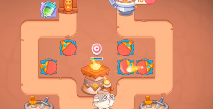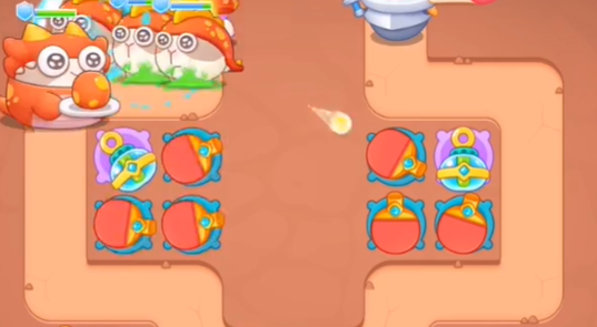 1、进入游戏将两个乒乓球炮塔升到最高级,再在上面建造一个针管炮塔攻击建筑。