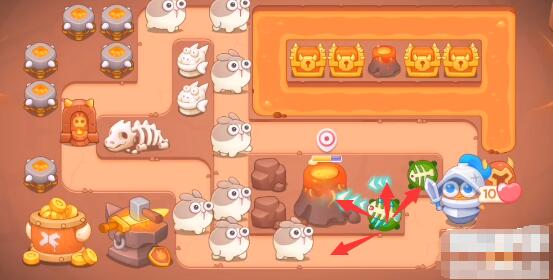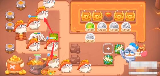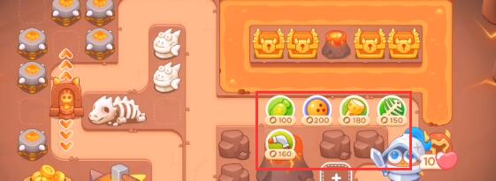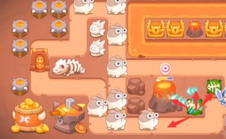 2、游戏开始先将鱼刺升满级放到地图后面用来清理障碍的同时打怪,再清大火山。