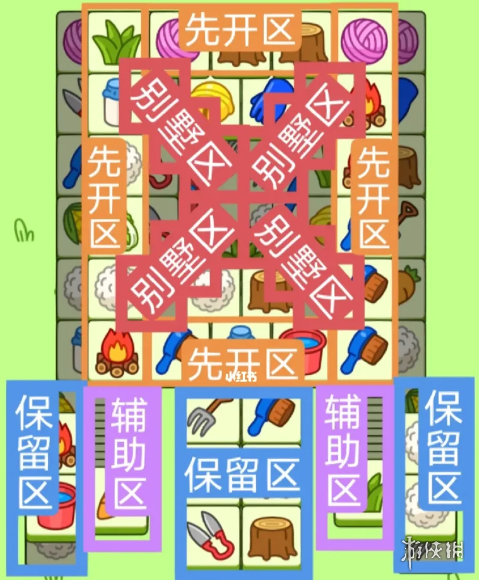 1、四个斜着的长形别墅,开局先消除橙色区,这里压牌比较多。