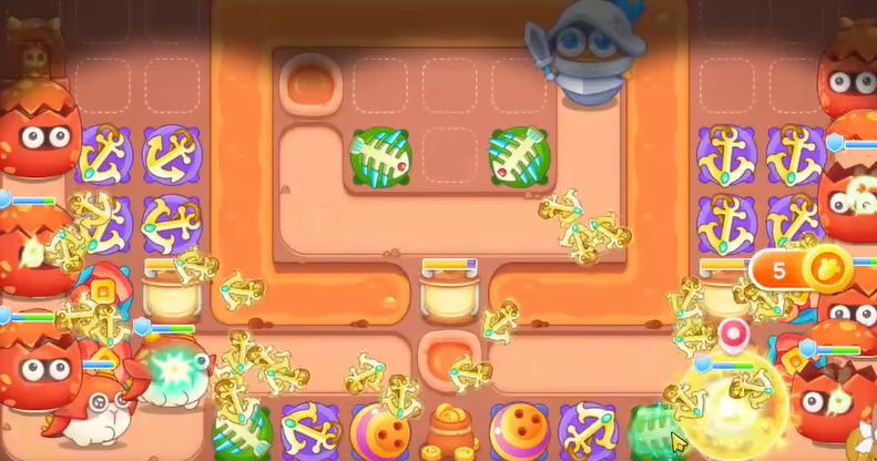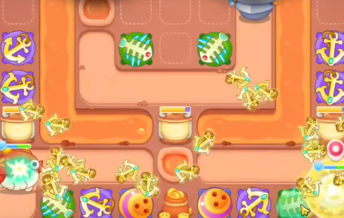 4、下面增加两个船锚,上面两个个鱼刺,继续清理障碍物。