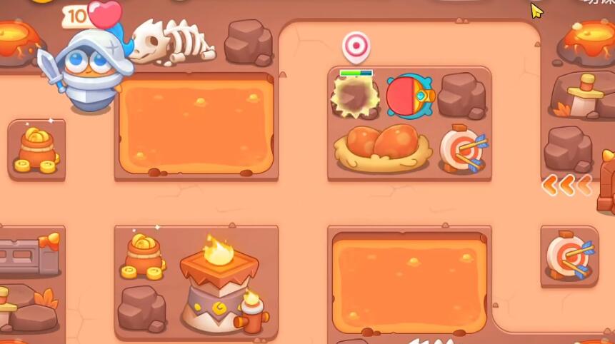 6、将附近的岩浆打掉,在上面放置球拍,在右下的位置放置一个火瓶。