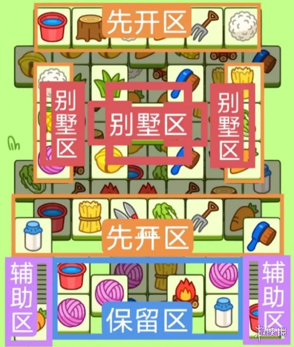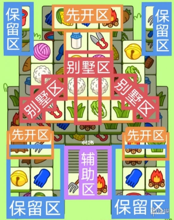 —个T字型大别墅,两个斜着的长形别墅。先把星座牌点完,开局先消除橙色区,这里压牌比较多。然后按照一层层均匀消除表面牌。不要跨层太多拿牌。必要时可以用盲盒区辅助消除表面牌。尽量还是以别墅区内互相消除为主。蓝色区基本都是明牌。全部保留到后期更用。