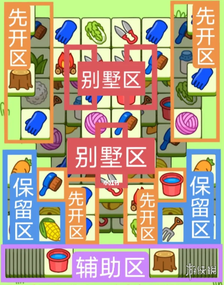 3、尽量还是以别墅区内互相消除为主,蓝色区有叠牌,但是不多,全部保留到后期使用。