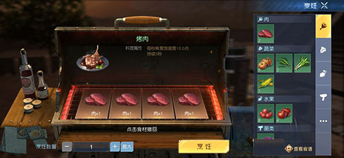 一块肉做的烤肉每秒加2.5饱食度,四块肉做的烤肉是每秒10点饱食度,共三秒。