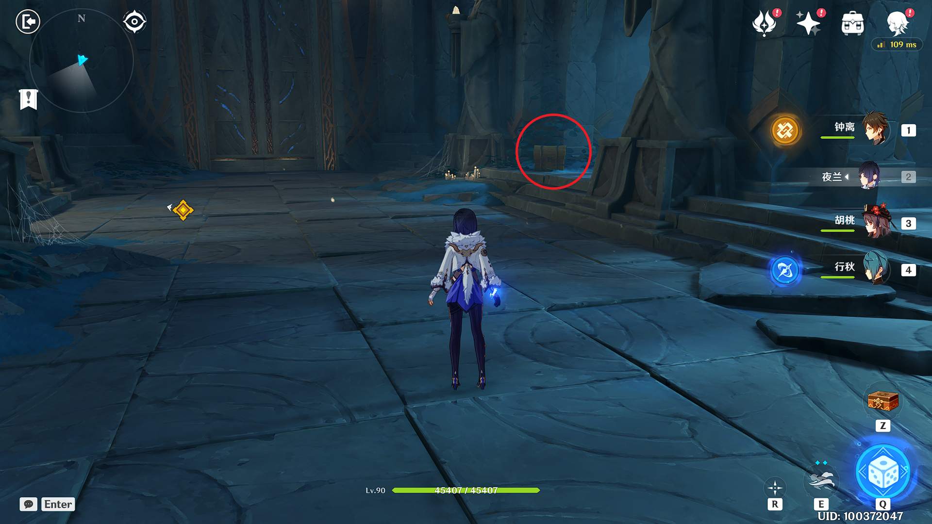 1,首先我们进入遗迹,穿过正在朝拜的丘丘人,来到前面的房间内