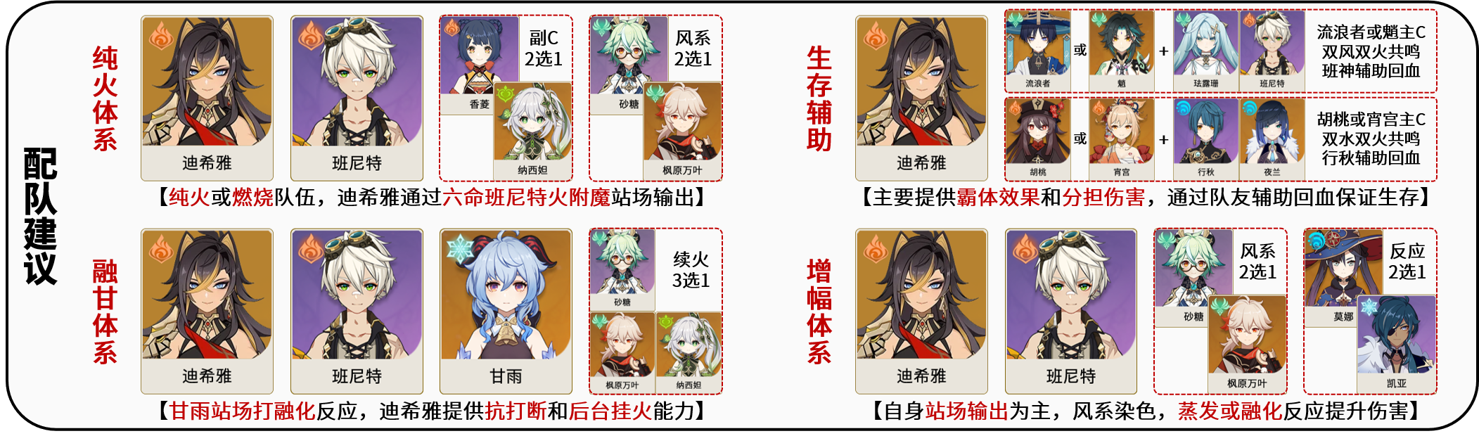 【纯火体系】迪希雅+班尼特+副C(香菱/纳西妲)+风系(砂糖/万叶)
