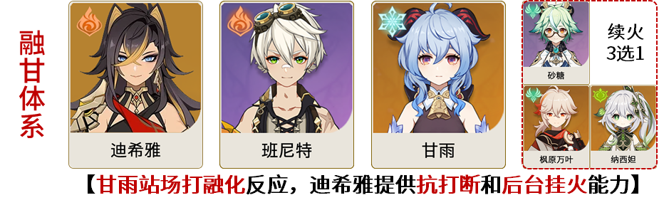 【融甘体系】迪希雅+班尼特+甘雨+续火(纳西妲/砂糖/万叶)