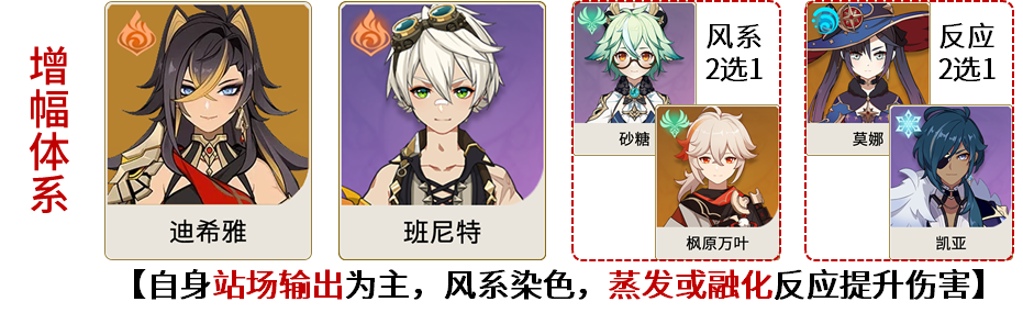 【增幅体系】迪希雅+班尼特+反应(莫娜/凯亚)+风系(砂糖/万叶)