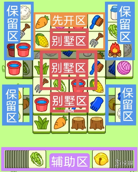 2、开局先消除橙鱼区,然后按照一层层均匀消除表面牌,哪里压牌旺较多就先消除哪里,必要时可必用首盒区辅助消除表面牌。