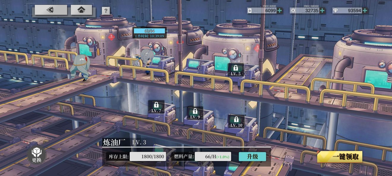 炼油厂是生产出战必需的重要物资——“燃料”的重要场地,这里一共有设有六个工作位置,只要安排舰灵在这里工作,每隔一段时间,就会出产一定量的燃料,指挥官只要点击一键领取或港区主界面漂浮在炼油厂上的泡泡,就能够将出产的资源搜集到个人背包里啦!偷偷告诉指挥官,安排的舰灵越多,工作效率越高哦~