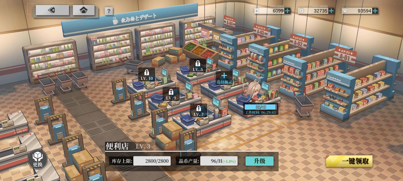 便利店与炼油厂相同,设有六个收银点,安排舰灵进行收银工作会提升产出效率。当其他舰灵来到便利店进行消费时,指挥官就能收获购买物资和升级时必须的晶币喽~⁄(≥▽≤)/~便利店的仓库容量同样有限,指挥官同样要记得来领取资源哦!