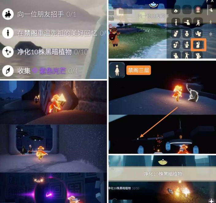 收集紫色光芒:紫光在禁阁一层右侧两人门内,进图动画结束后会在右侧出现