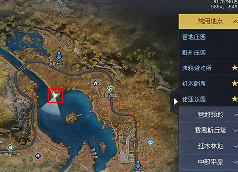 1、如图所示,首先来到湖畔镇,向上方前进来到红框位置。