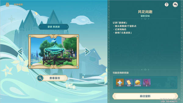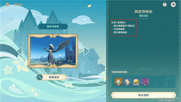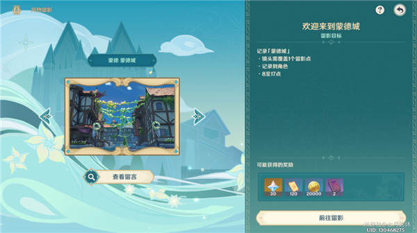 玩家前往蒙德城、蒙德广场、果酒湖等地按照要求拍照留影即可过关了,非常简单哦。