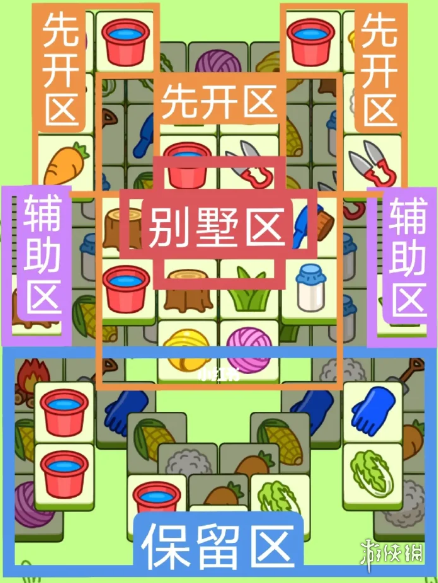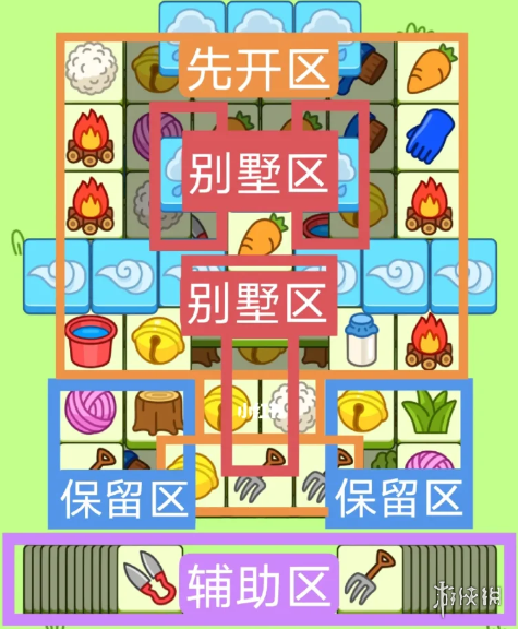 3.必要时可以用紫色盲盒区辅助消除,盲盒区后期不用留太多,留几张备用即可。