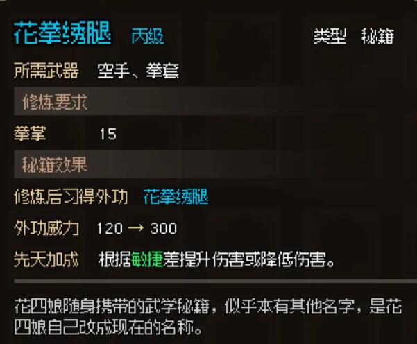 满59好感,晚上触发3个黑衣人剧情,打赢后,四娘入队,获得蓝色品质拳法【花拳绣腿】【四娘宝箱的钥匙】