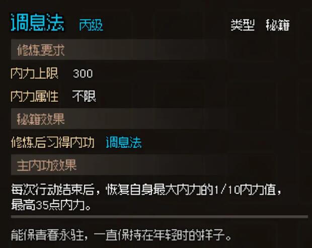 好感满59,触发找灵芝剧情,完成后【仁德+3】,【调息法】