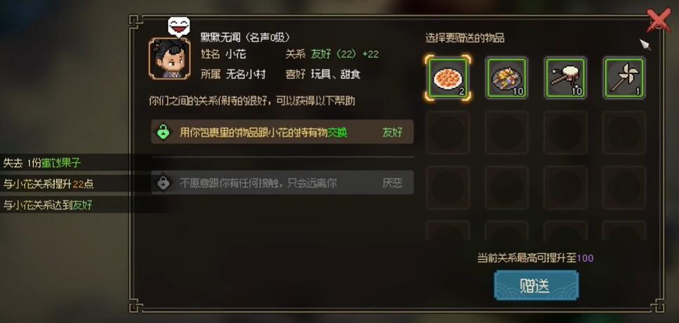 4、再次和她对话,使用蜜饯果子来提升好感。