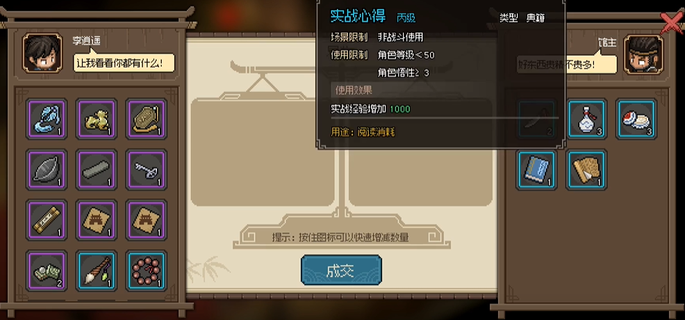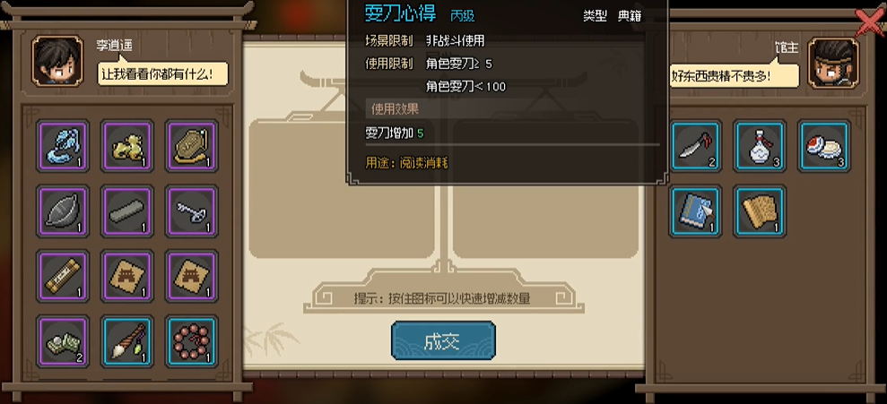 2、比较值得易物的物品有耍刀心得、实战心得这两本典籍。