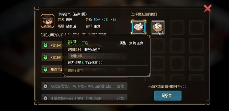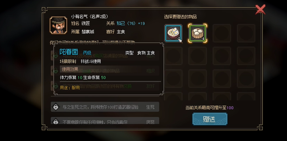 1、一直送礼物可以增加好感度至生死之交,即可获得打造武器经验。