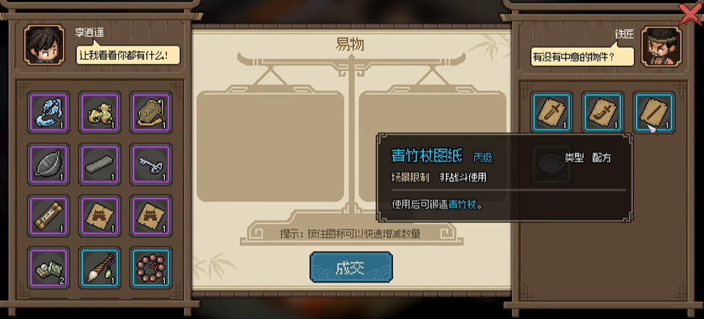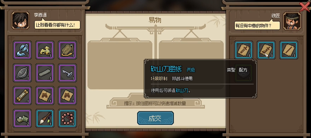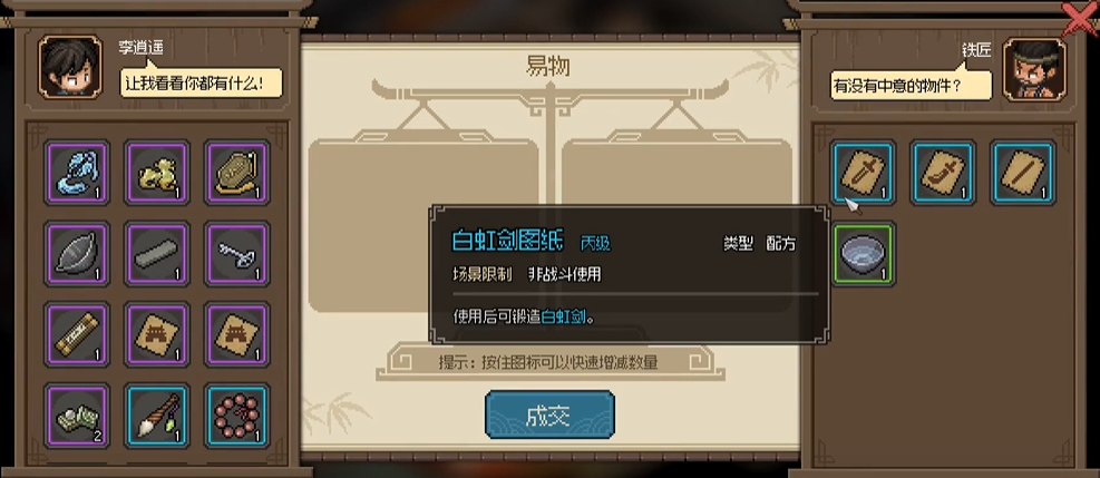 2、值得易物的物品有白虹剑图纸、砍山刀图纸、青竹杖图纸。