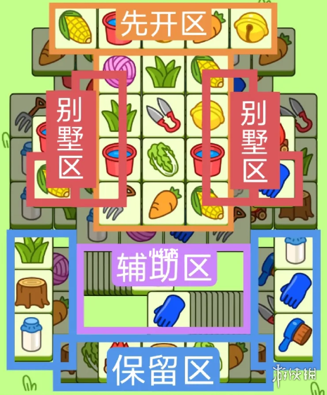 四个三角形别墅。开局先消除橙色区,然后按照一层层均匀消除表面牌。哪里压牌比较多就先消除哪里。必要时可以用盲盒区辅助消除表面牌,尽量还是以别墅区内互相消除为主。蓝色区有叠牌,但是不多,全部保留。