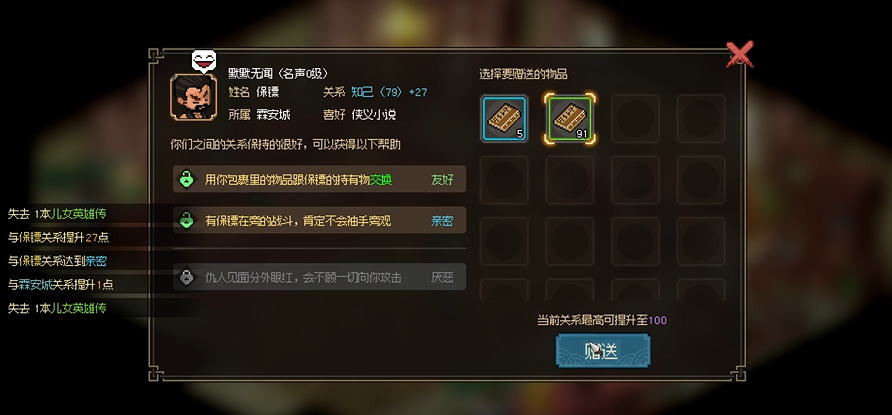 1、赠送儿女英雄传,增加27点好感,关系到达【友好】。
