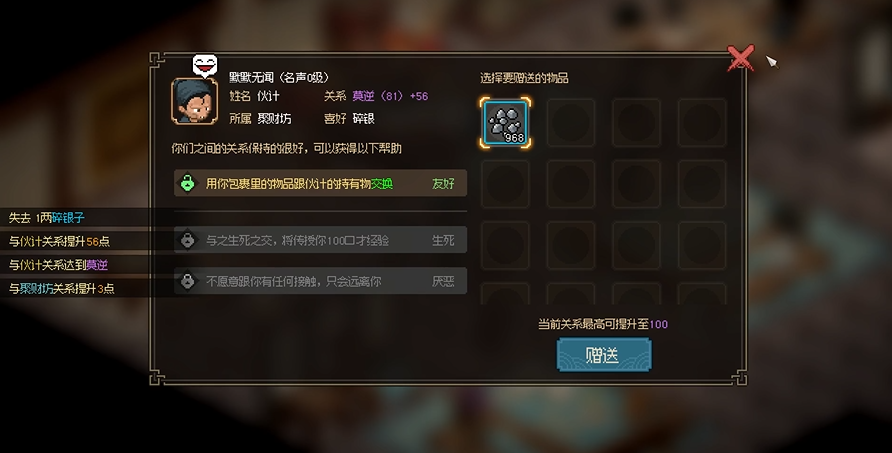 1、赠送碎银子,增加56点好感,直至关系到达【生死】,获得100点口才经验。
