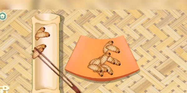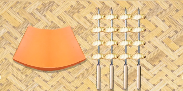 1、首先用镰刀把竹子切开,把蚕蛹夹橘色碟子上。